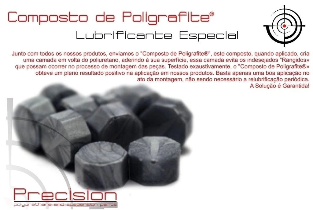 - - - Sem Barulhos ou Rangidos! Junto com todos os nossos produtos, enviamos o "Composto de Poligrafite®", este composto, quando aplicado, cria uma camada em volta do poliuretano, aderindo à sua superfície, essa camada evita os indesejados "Rangidos" que possam ocorrer no processo de montagem das peças. Testado exaustivamente, o "Composto de Poligrafite®" obteve um pleno resultado positivo na aplicação em nossos produtos. Basta apenas uma boa aplicação no ato da montagem, não sendo necessário a relubrificação periódica. A Solução é Garantida! - - -